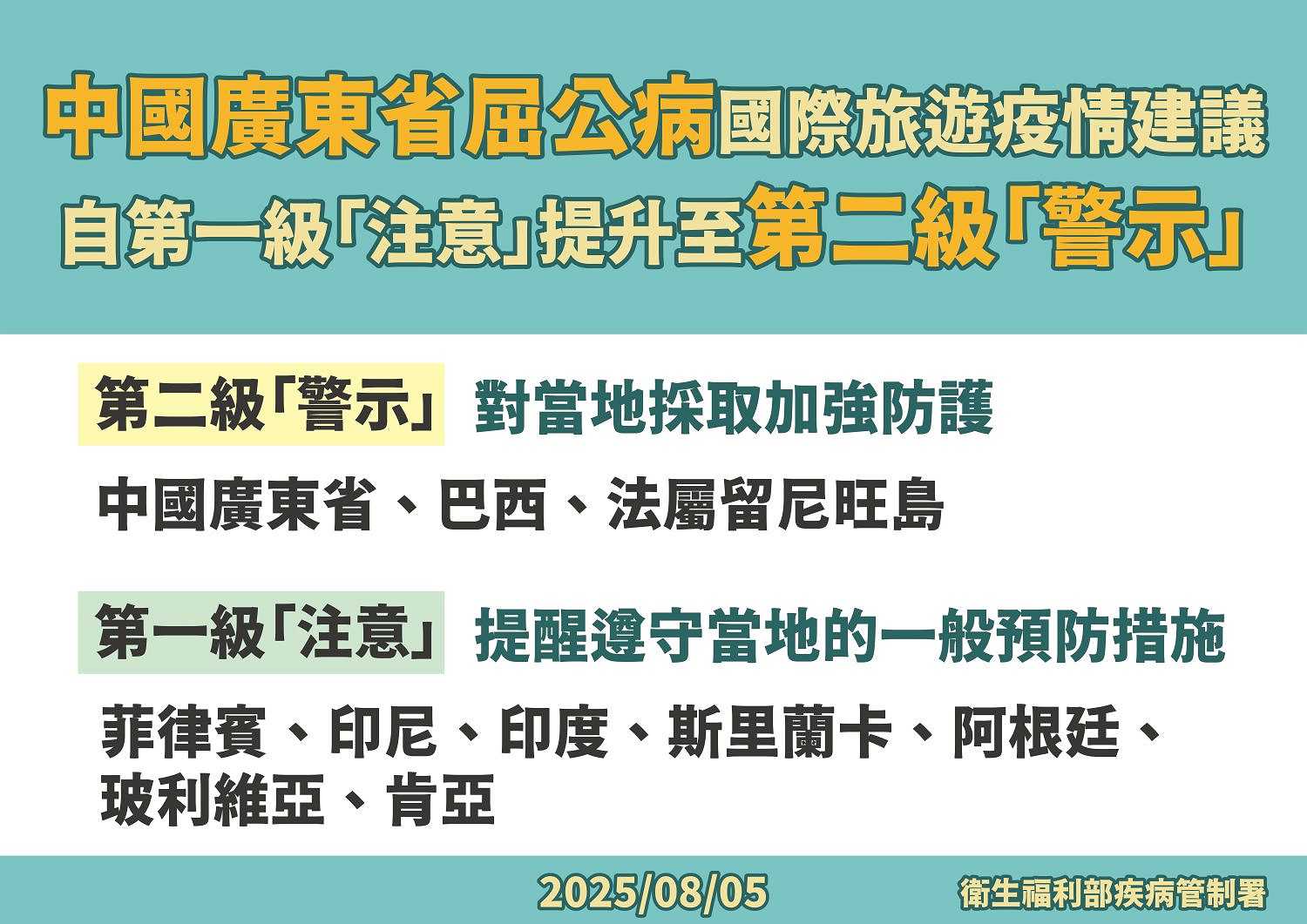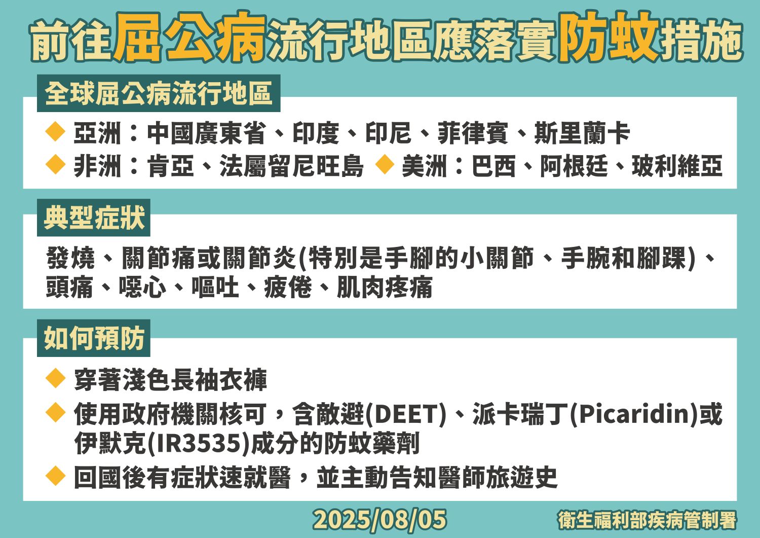 依據衛生福利部疾病管制署公告,根據疾管署資料,截至8月4日,今年全球屈公病通報已超過25萬例,世界衛生組織(WHO)亦於7月22日呼籲各國應嚴加防範。全球疫情以美洲地區及印度最為嚴峻,而中國廣東省疫情自7月以來急遽惡化,國內共通報16例屈公病境外移入病例,創下近6年同期新高,請有出國規劃或已返國之師生提高警覺。